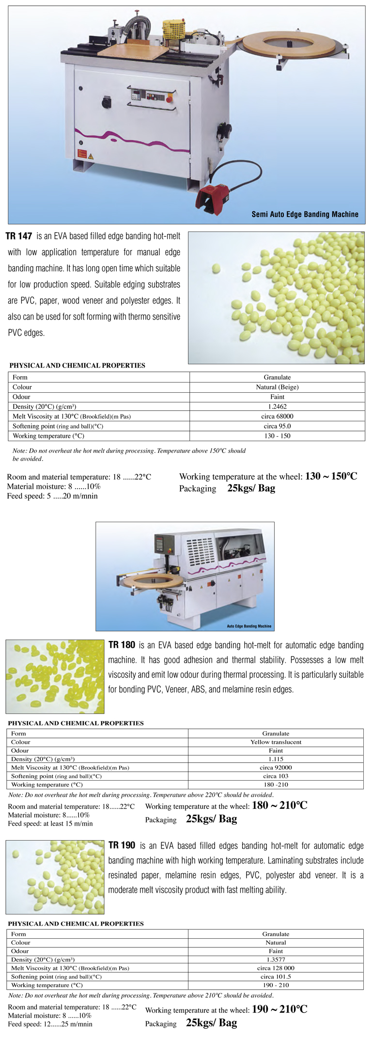 TR 147 is an EVA based filled edge banding hot-melt with low application temperature for manual edge banding machine. It has long open time which suitable for low production speed. Suitable edging substrates are PVC, paper, wood veneer and polyester edges. It also can be used for soft forming with thermo sensitive PVC edges.