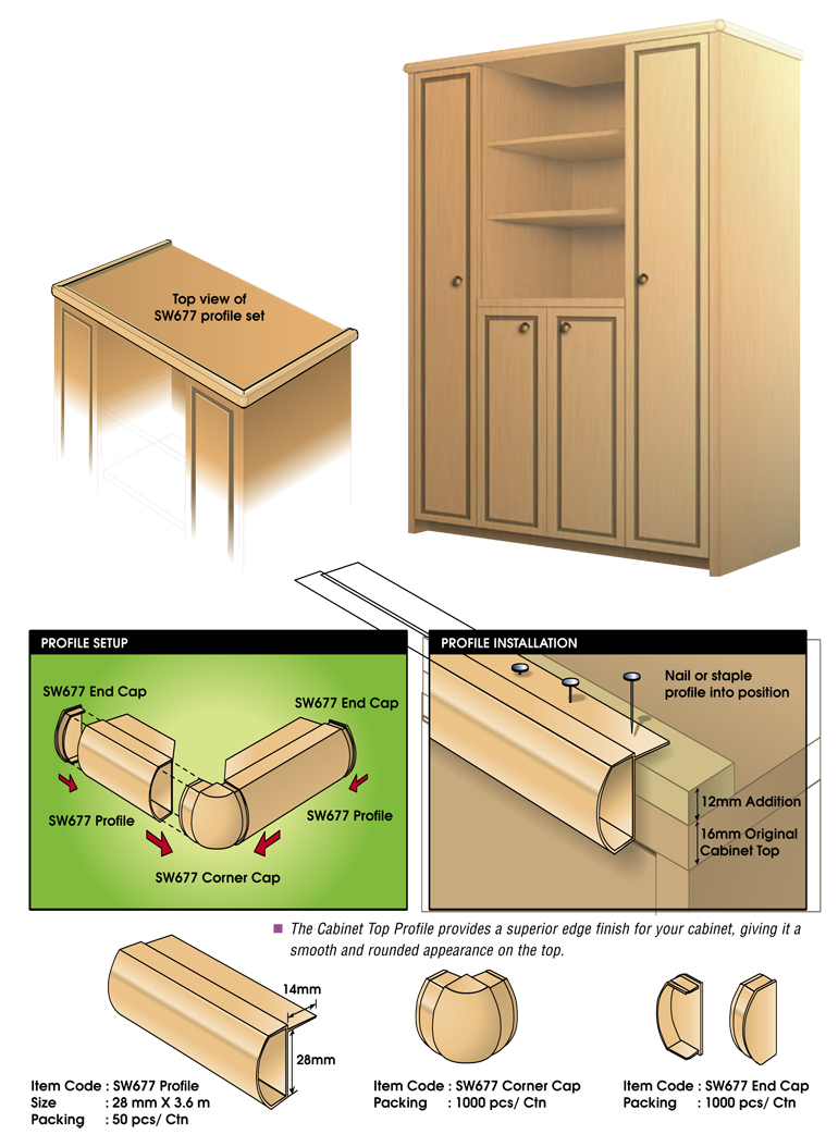 The Cabinet Top Profile provides a superior edge finish for your cabinet, giving it a smooth and rounded appearance on the top.